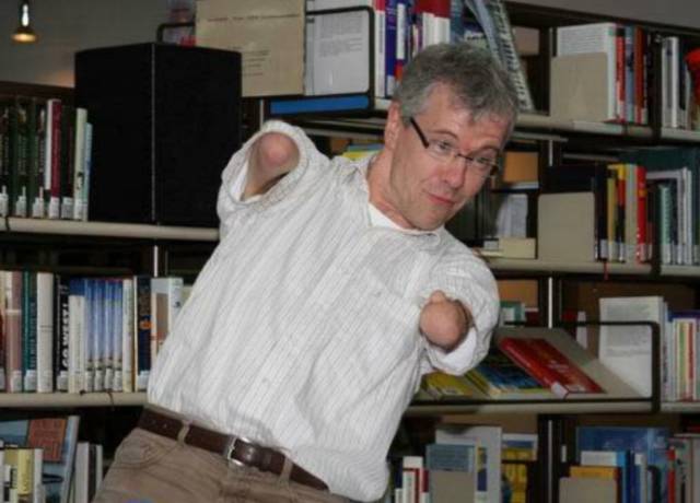 施密特于1965年,出生在德国。出生的第一天,就让父母陷入绝望中,因为他一生下来就没有下手臂,他的左腿正常,但右腿比左腿短30公分。他的父母问:“怎么会是这样?”妇产科的医生认为是在手臂形成初期就被脐带缠住,所以无法顺利长成。但腿部的残疾如何解释呢?医生问他的母亲,是否服用过一些孕期禁药,但他的母亲很清楚没有,她还被医生告知,可能以后再也不能生育了,母亲无法承受这样的打击,情绪变得非常糟糕,只能靠镇静剂来维持情绪。